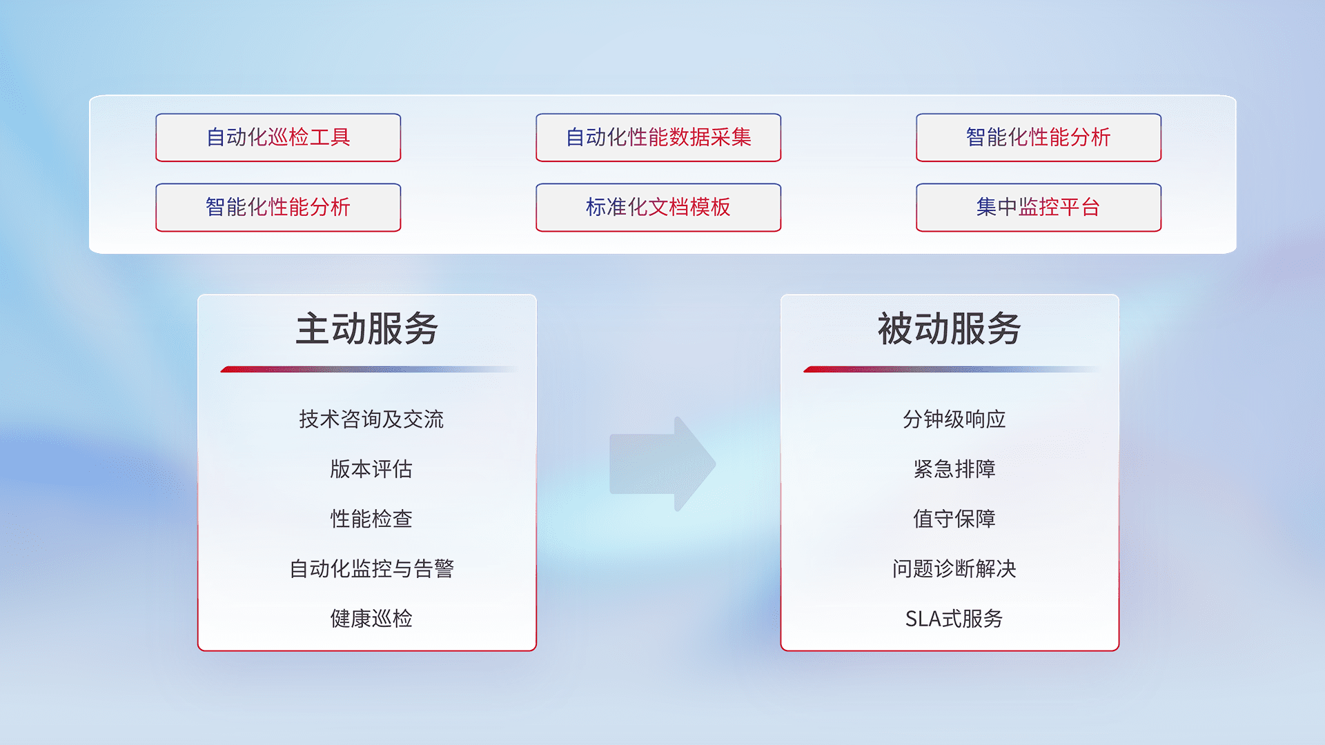 智能化工具和标准化文档,,,,保障服务质量,,提供主动服务(包含技术咨询、、、版本评估、、性能检查、、自动化监控与告警、、、健康巡检)和被动服务包含(分钟级响应、、紧急排障、、值守保障、、、问题诊断解决、、SLA服务)。。。。