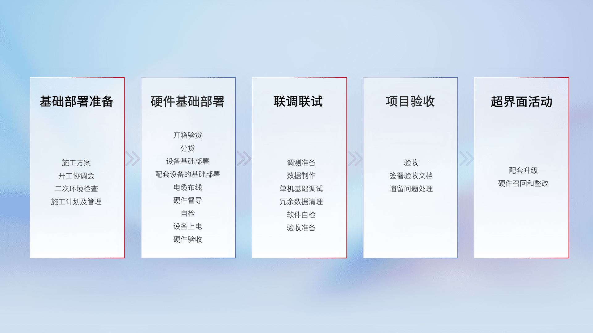 从基础部署准备、、、、硬件基础部署、、联调联试、、、、项目验收、、、、越界面活动的全过程可追溯,,,保证施工质量和进度。。