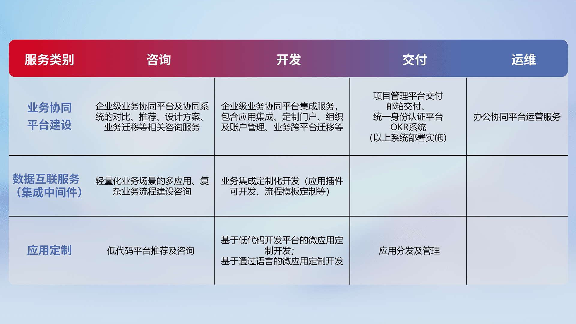 针对钉钉、、、、企微、、、、IDaas等平台级产品提供产品的规划、、、方案、、、交付、、定制化开发等服务,,,实现如统一协同办公、、、、智能客户服务、、混合会议管理、、、、智能数据查询、、、、等业务场景,,,,实现数字化转型。。。。